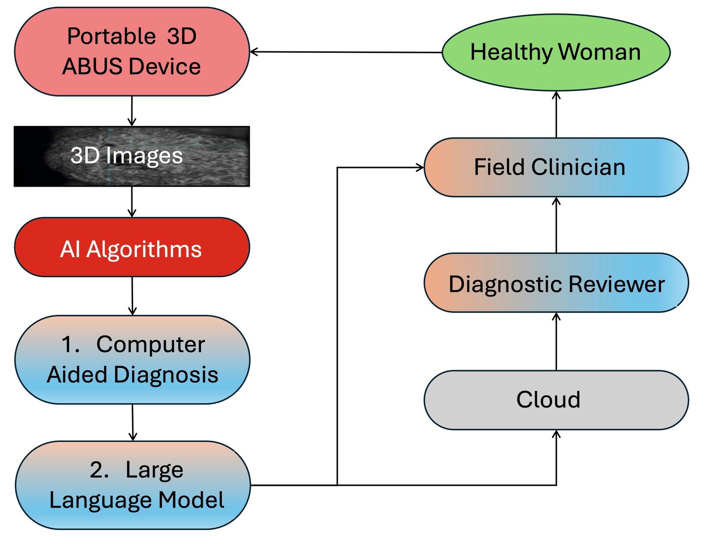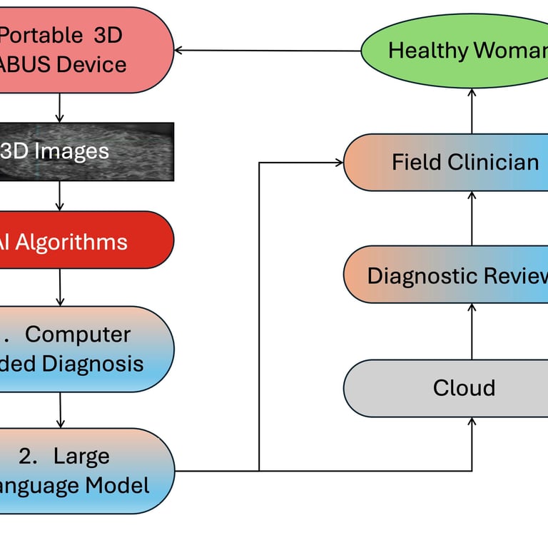 The first diagram shows a field clinician moving the portable 3D ABUS device over the woman's breast, while the adjacent flow diagram demonstrates how the 3D system will be applied in the field. The clinician engages with a healthy woman volunteer using the portable device which generates 3D images of each breast. There are two places in the data flow where AI plays an important role after acquisition of the 3D images and artefacts have been removed: (1) an algorithm based on convolutional neural network (CNN) technology is applied to detect breast lesions; and (2) a large language model (LLM) interacts with both the diagnostic reviewer (i.e. radiologist) and the field clinician. If a malignant lesion is detected, the woman will be referred for further testing and treatment.