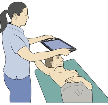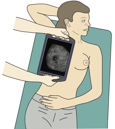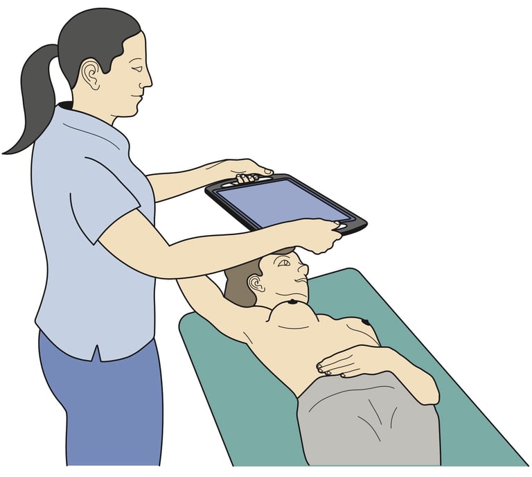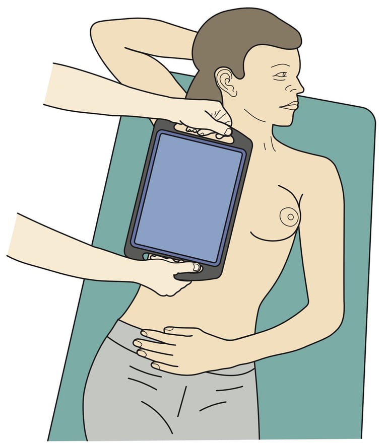 The field clinician places the 3D ABUS device on the woman's breast. At this stage the screen on the tablet computer is blank.