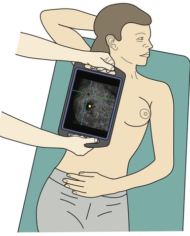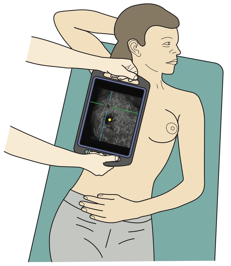 Next she turns on the AI algorithm which highlights the nipple (yellow dot) and identifies the malignant lesion in the cross hairs.